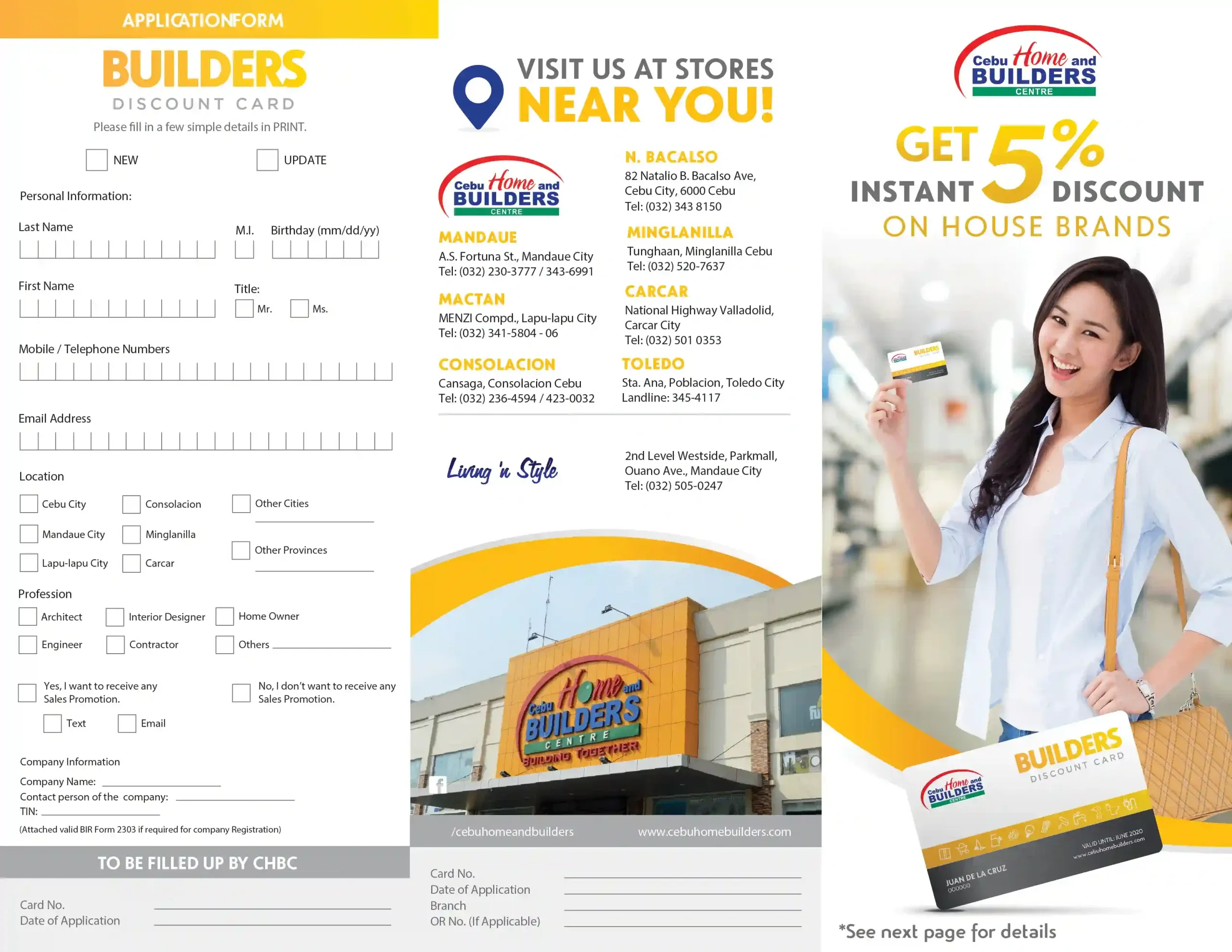 - No Builders Discount Card, no discount; customers must present the CHBC-Builders Discount upon purchase at any Cebu Home and Builders Centre and Living n’ Style stores.